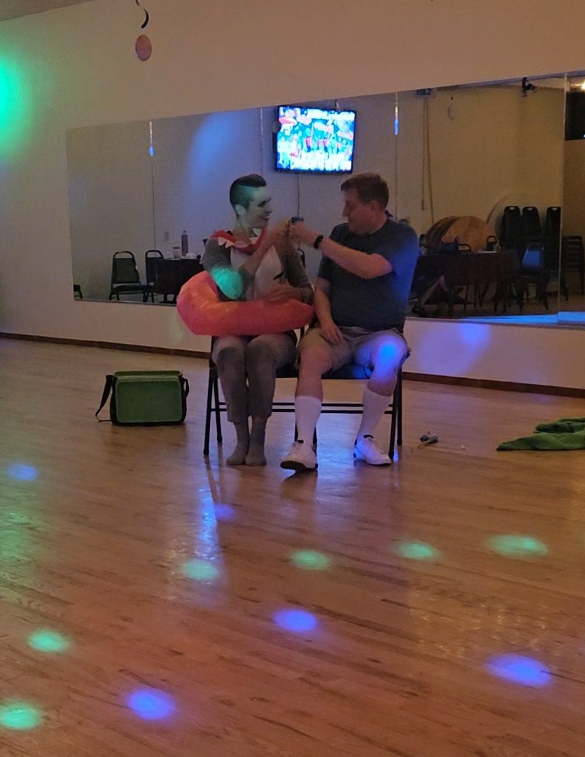 Shark (Marlena) and fisherman drinking together after floor and chair dance.