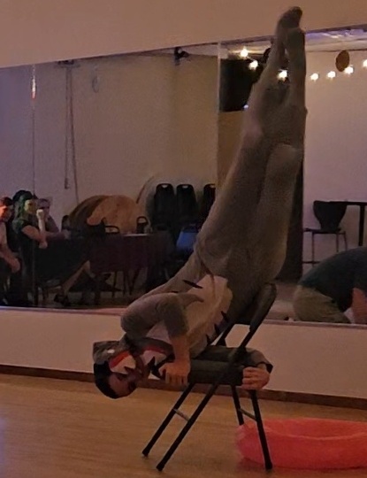 Dressed in a shark onesie, doing a shoulder stand on a chair.
